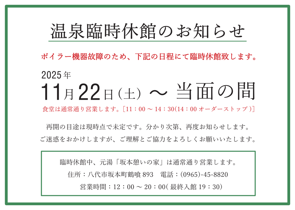 また、元湯坂本憩いの家は通常通り営業中です。休館中はこちらをご利用ください。