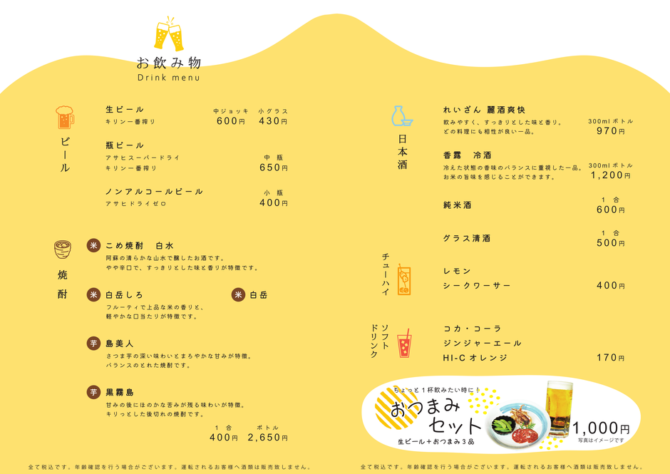 ソフトドリンク | コカコーラ、オレンジ、ジンジャーエール など |
