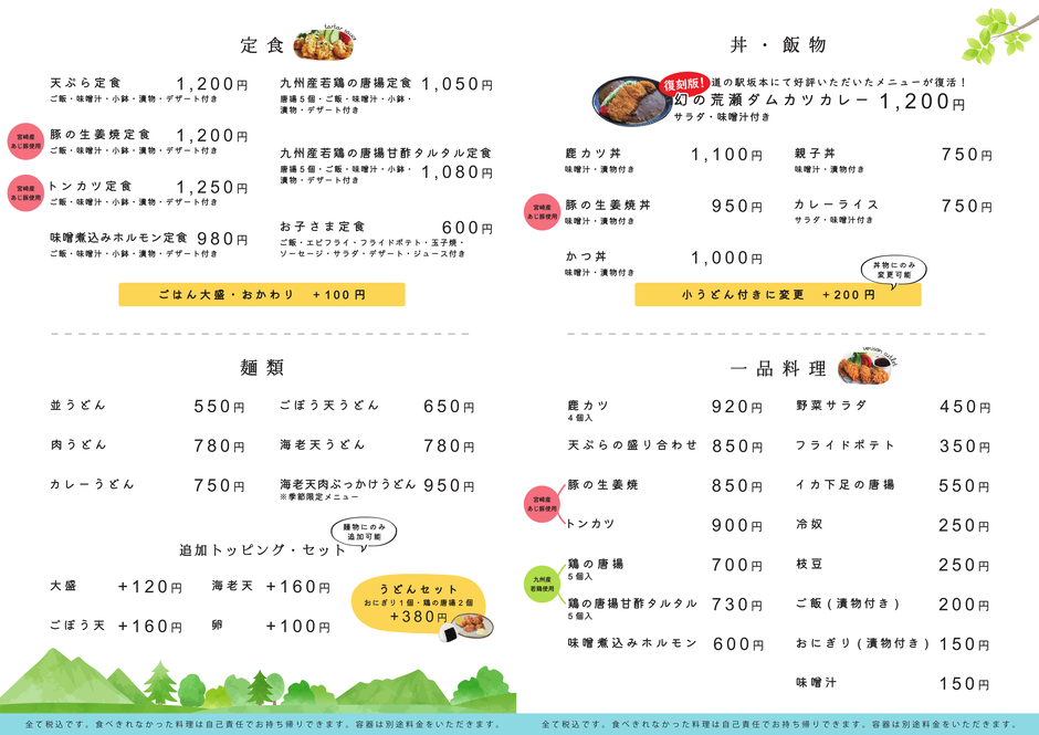 定食 | 天ぷら、鶏の唐揚げ、豚の生姜焼 など |